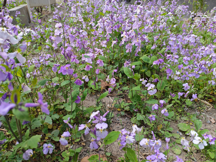 沿着小区的小路慢慢前行,刻意寻觅并发掘许多平日里被忽略的小美好,那些常常被忽视的角落,早已悄悄绽放出了生机。路边有几株樱桃李,已然悄悄开花;紧邻的刚刚从沉寂中苏醒过来的樱花,也静静绽放,不与群芳争艳。地面上,一团一团的紫色小花格外显眼,我拍照搜了一下,是早开堇菜。走到9号楼一层的前面,又看到一片兰花,模样有些像蝴蝶兰,再次拍照查询,原来叫诸葛菜,也称二月兰。跟诸葛亮有关系,相传诸葛亮北伐时,曾经以此菜补充军粮。我记在心里,改天讲给问问听。“年年樱花雨,岁岁二月兰”,这不起眼的蓝紫小花,开得热烈而执着,格外讨人欢喜。