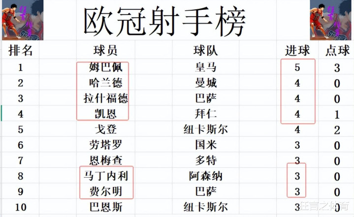 射手榜方面,姆巴佩5球继续稳居榜首,哈兰德,戈登破门,拉什福德双响,三人追上凯恩4球并列第2。费尔明上演帽子戏法,和劳塔罗,恩梅查,马丁内利等人将前十门槛提高到3球。
