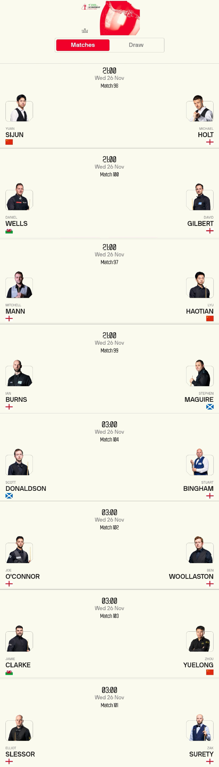 今天完整赛程安排详情如下图,比赛采用11局6胜制。