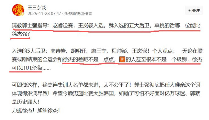 有球迷认为:无论在联赛或刚结束的全运会,上面的五位后卫和徐杰的差距不是一点点,有的人甚至根本不是一个级别,徐杰可以甩几条街……。这位球迷请教郭士强指导:赵睿退赛,王岚嵚入选。就入选的五大后卫,单挑的话哪一位能比徐杰强?
