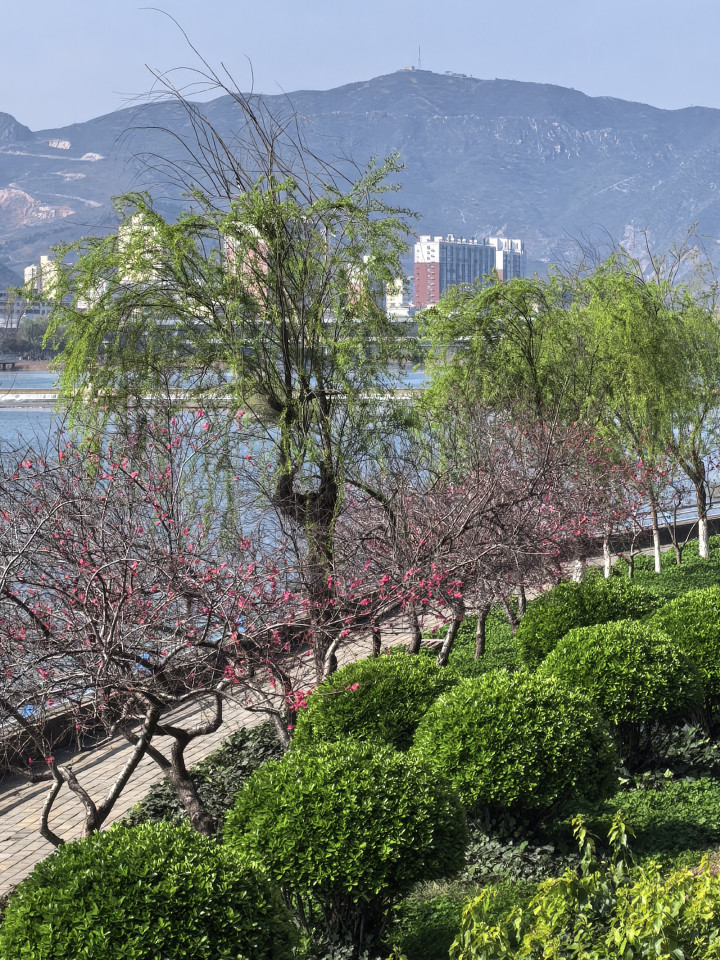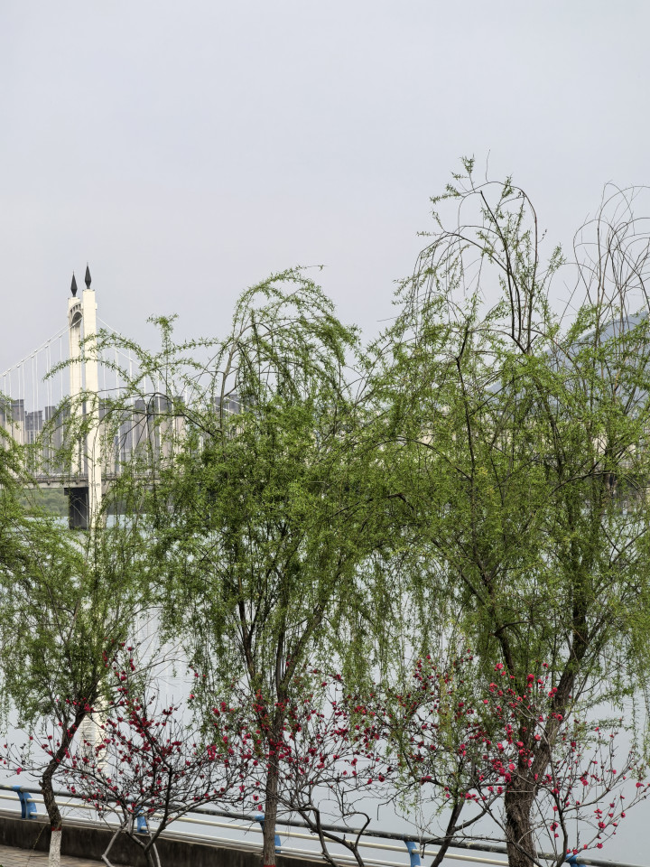再看岸边的柳树,画风一转,变得温柔起来。如果说桃花是热烈奔放的红衣少女,那柳树就是温婉居家的小家碧玉。长长的枝条刚吐出嫩芽,远远望去,像是一团团绿色的烟雾,朦朦胧胧的。风一来,柳枝便扭动着腰肢,轻盈地跳起舞来,那一点点新绿,在阳光下通透得像翡翠,看着就让人心里透亮、舒坦。