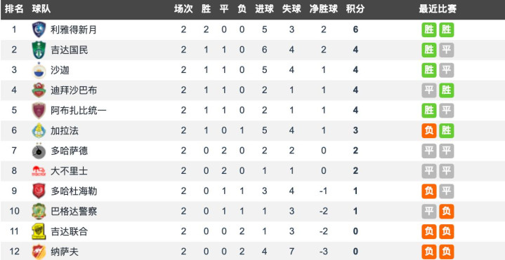 卡塔尔联的杜海勒本轮主场迎战沙特联的吉达国民,最终两队2-2握手言和。吉达国民1胜1平凭借净胜球优势排在积分榜第二,杜海勒1平1负凭借净胜球优势排在积分榜第九。
