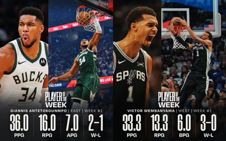 因为前三场表现出色,字母哥还当选了第一周的东部周最佳球员,西部与他一同当选的是今年开局另一MVP大热文班亚马。
