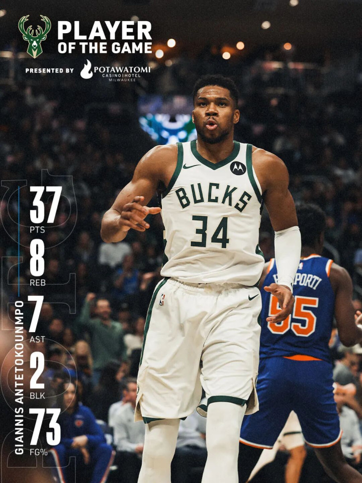今年开赛至今,字母哥的表现也绝对是MVP级别,本场之前的三场比赛: