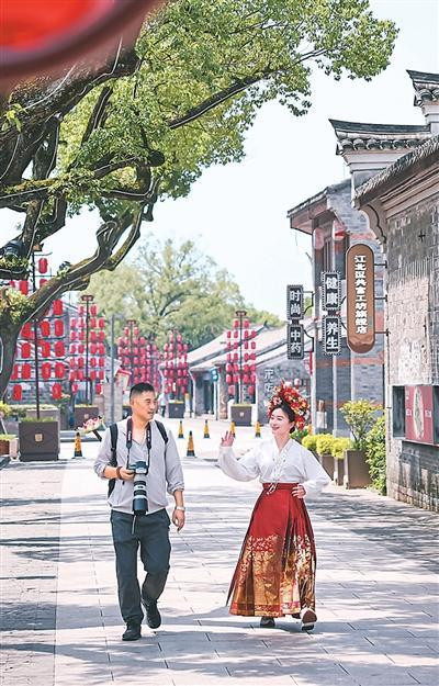 旅拍摄影师与游客行走在浙江宁波慈城古县城景区内。