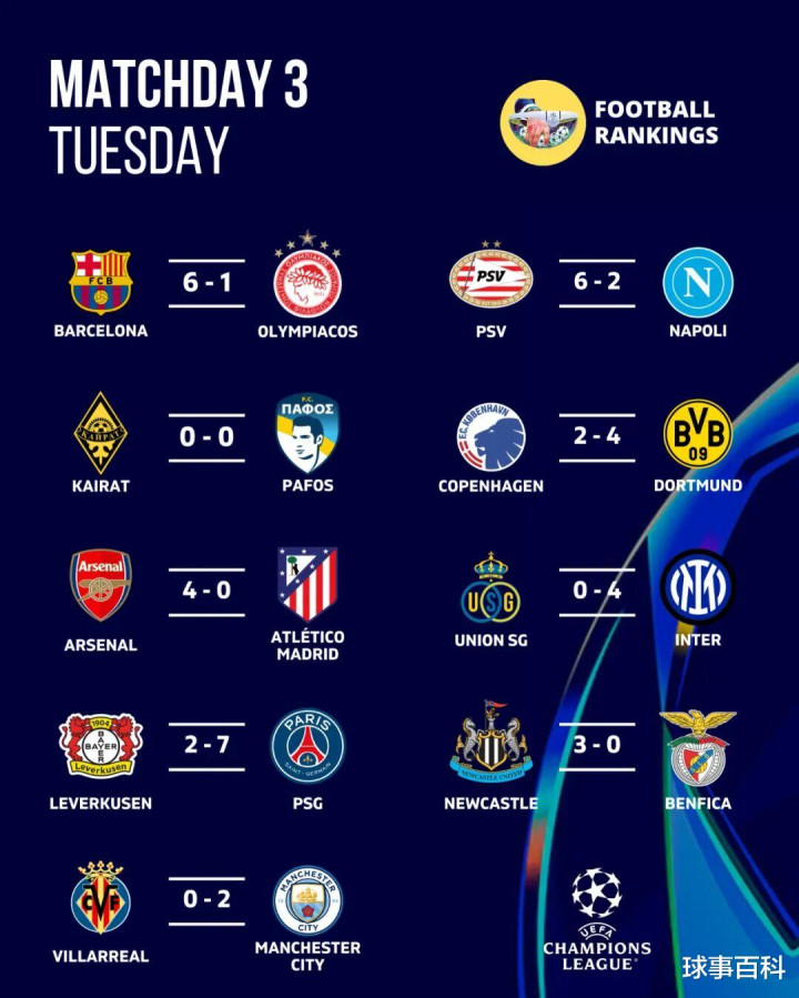 欧冠联赛阶段第3轮首个比赛日,各大豪门火力全开。在今日的9场比赛之中,除了阿拉木图凯拉特和帕福斯之间互交白卷之外,其余8场比赛狂轰43球,其中甚至还有巴黎7-2血洗勒沃库森、埃因霍温6-2大胜那不勒斯这样的比赛,而巴萨6-1击败奥林匹亚科斯的比赛进球数甚至都只能屈居第三。