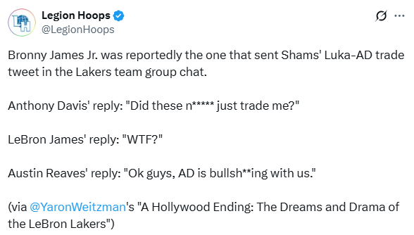 据《纽约邮报》记者Yaron Weitzman报道,当浓眉被交易时,詹姆斯在湖人群聊中发送了一条只有三个字母的简短信息。