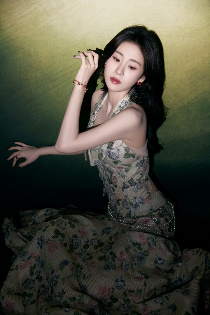 当张碧晨卸下舞台上的流光溢彩,扎着低马尾穿卫衣出现在机场时,总有人说她“普普通通”——素净的眉眼、松弛的神态,像巷口咖啡馆里捧着书的邻座姑娘。可这组玫瑰纹样的写真,却像一把钥匙,撬开了她藏在朴素里的奢华:晕染着茶棕底色的裙装裹着纤秾合度的腰肢,珍珠链条随着裙摆漾开细碎的光,红唇衬着垂落的黑发,连指尖的墨绿甲油都成了点睛的艳色。
