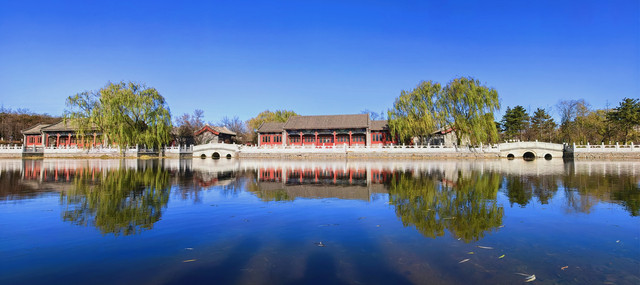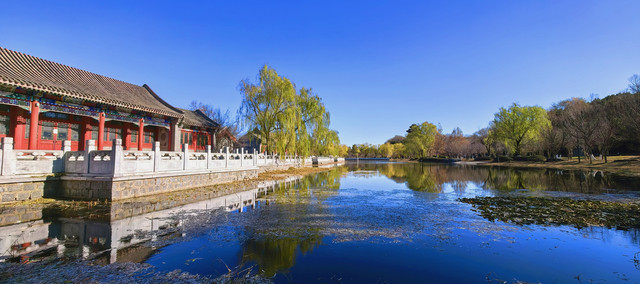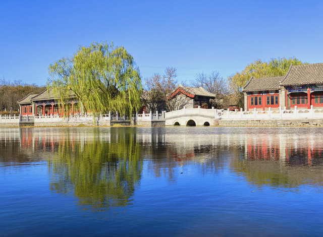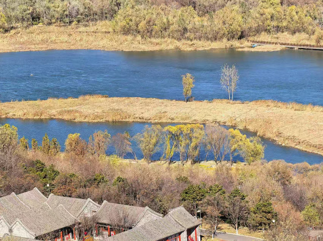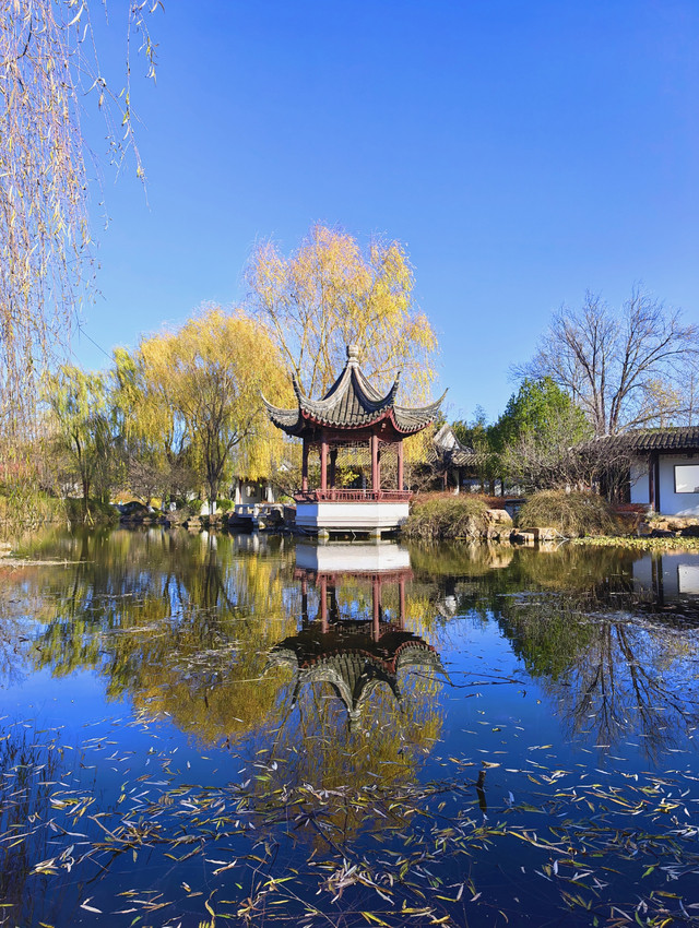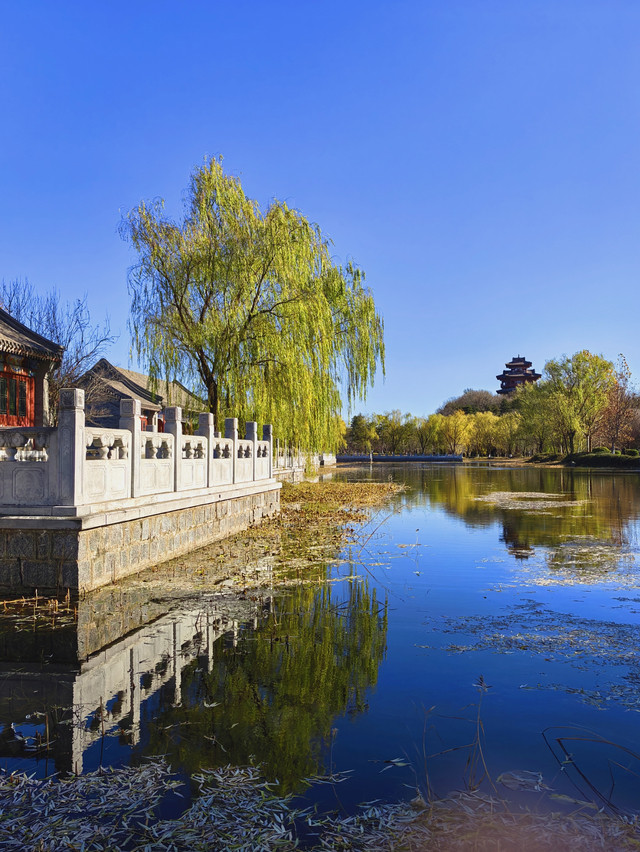 远山轮廓清晰,层林色彩斑驳。近处岸边的柳树万千丝绦如流苏般低垂,在清寒的风中轻摇,与沉静的湖水、蔚蓝的天幕构成一幅绝美的图画。